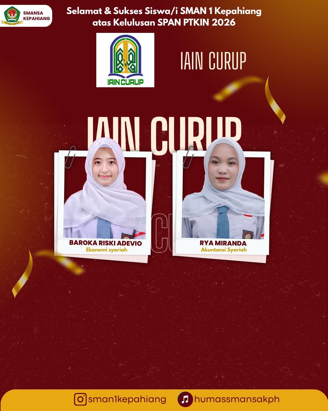 Keberhasilan ini diharapkan dapat menjadi motivasi bagi seluruh siswa SMAN 1 Kepahiang untuk terus berprestasi dan tidak ragu dalam mengejar pendidikan ke jenjang yang lebih tinggi.